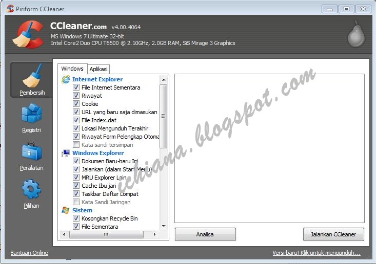 Udah banyak yang tahu kan ya? CCleaner adalah software buat "bersih-bersih" laptop. Cukup ampuh menurut saya buat ngebersihin "sampah" dan "debu" yang berterbangan *ejaannya bener ga ya?* dalam laptop saya. Software ini bisa membersihkan file-file "sampah" yang paling banyak dari hasil saya browsing sana-sini. Mulai cache, history, registry, file bekas uninstall program, recycle bin dll pokoknya banyaklah, saya lupa dan ga ngerti kalo harus nyebutin satu-satu.
